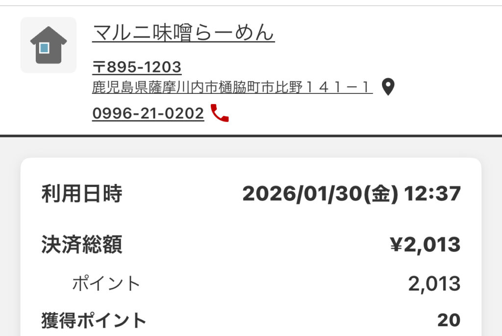 鹿児島に住む関西人のつぶやき 1711)_薩摩川内のマル二味噌らーめんをご紹介させて頂きます( ^ω^ ) いのとも 2026年2月3日 お昼ごはんに食べる機会がありましたよ! 会社の後輩と2人で 薩摩川内市のマル二味噌らーめんさんで昼食を食べる機会がありました。 12時前でしたが、駐車場はほぼ満車。 なんとか1台空きがあり、停められる感じでしたよ。 私は、シンプルな味噌らーめんとライスをオーダー。 満員だったので、少し待ちましたが、 ほどなく、目の前に登場です。 「味噌は日本人の宝物」と書かれた箸袋を破って、 箸を取り出して、食すのです。 写真では分かりづらいですが、 シナチク、メンマくんが、分厚くデカイです。 味噌らーめんは、美味しいございます。 味噌ラーメンと言えば、 霧島市にある全国チェーン店の麺場田所商店さんがありますが、 マル二さんの方が美味しいかなって感じでしたよ。 811)_味噌ラーメンと持っている男「清宮」 奥様はPayPayドームに遠征♪( ´θ`)ノ 2022年7月26日、いつものように私の弁当を作ってくれた奥様は、私が出社するの... ちなみにマル二味噌らーめんさんの食べログ評価は、 3.11です。 食べログの評価は厳しいですね。。。 https://tabelog.com/kagoshima/A4602/A460201/46017057/ 後輩の分の支払い、 2人で2013円でしたよ。 楽天ペイでの支払いです。 また、機会があれば食べたいと思う 美味しい味噌らーめんでした。 #マル二味噌らーめん #鹿児島に住む関西人のブログ ABOUT ME いのとも 鹿児島に赴任し30年暮らしてきた関西人の経験を踏まえたお得な情報を発信するブログです。知っているのと知らないのでは大違いな事を沢山経験してきましたので、お得情報のお裾分けが出来ればと思っております。