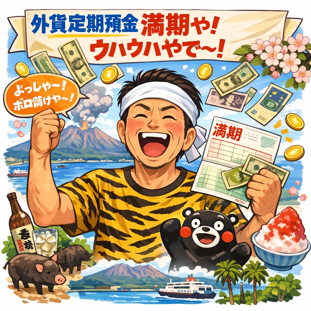 「外貨定期預金が満期を迎えて喜ぶ鹿児島に住む関西人の姿」を
