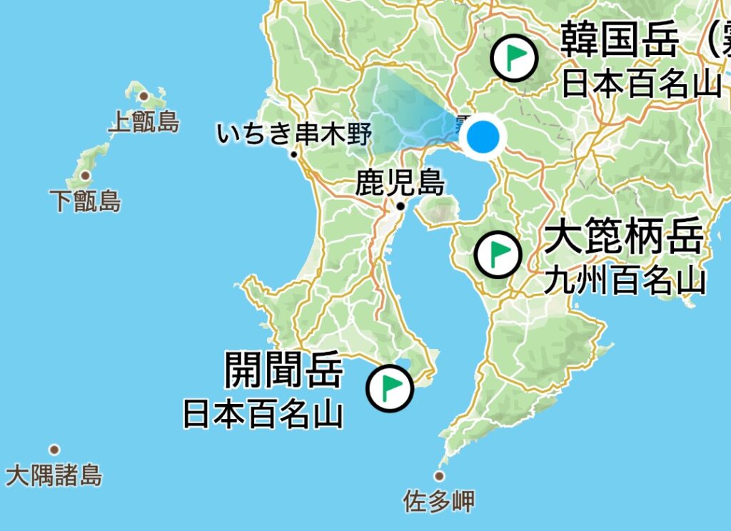 下記の地図で、青い丸が私の自宅がある霧島市で、