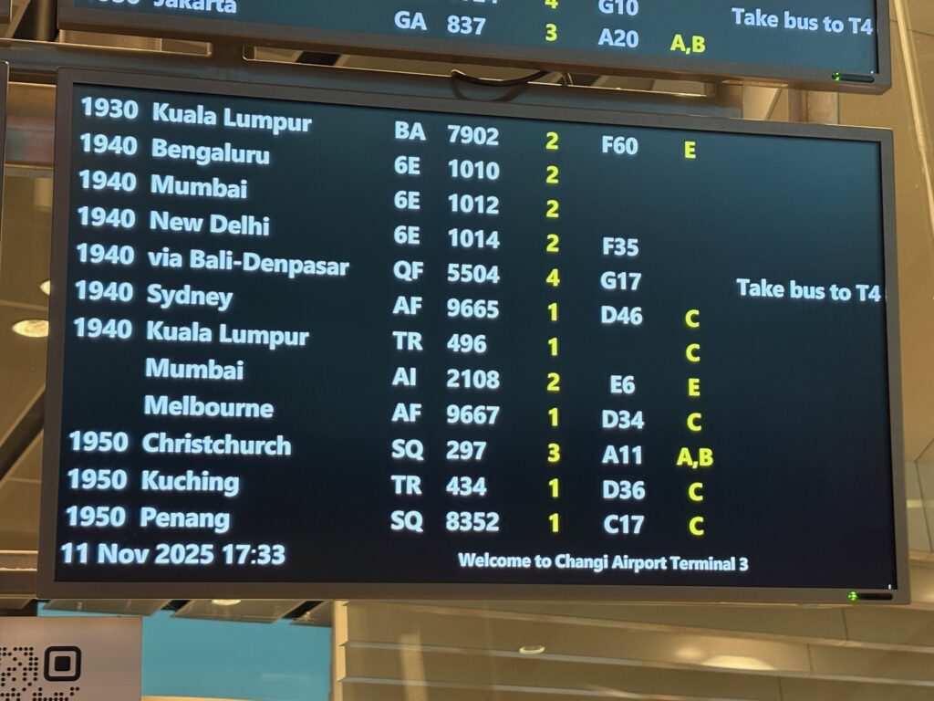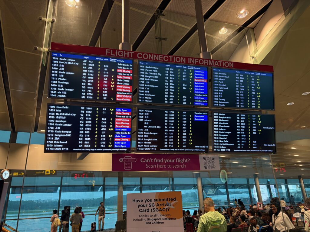 巨大な乗換案内のボードを確認し、次のペナン行きの飛行機が