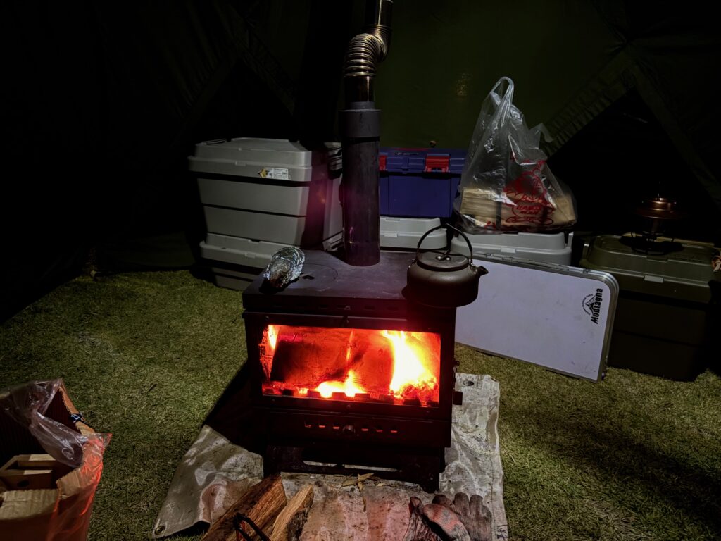 薪ストーブを使って暖をとるキャンプが始まりましたよ!