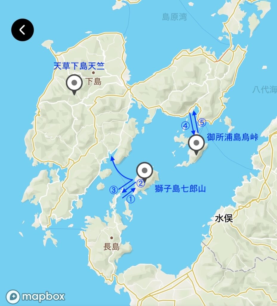 ②獅子島の片側港から長島町の諸浦港に戻ります。