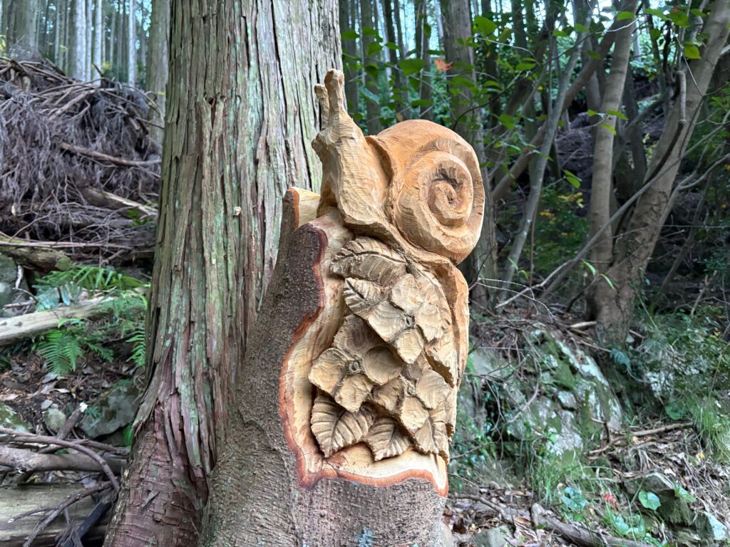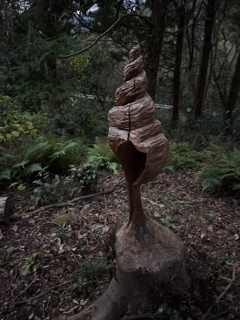 根っこまである木を彫って、巻貝の彫刻が作られています。
