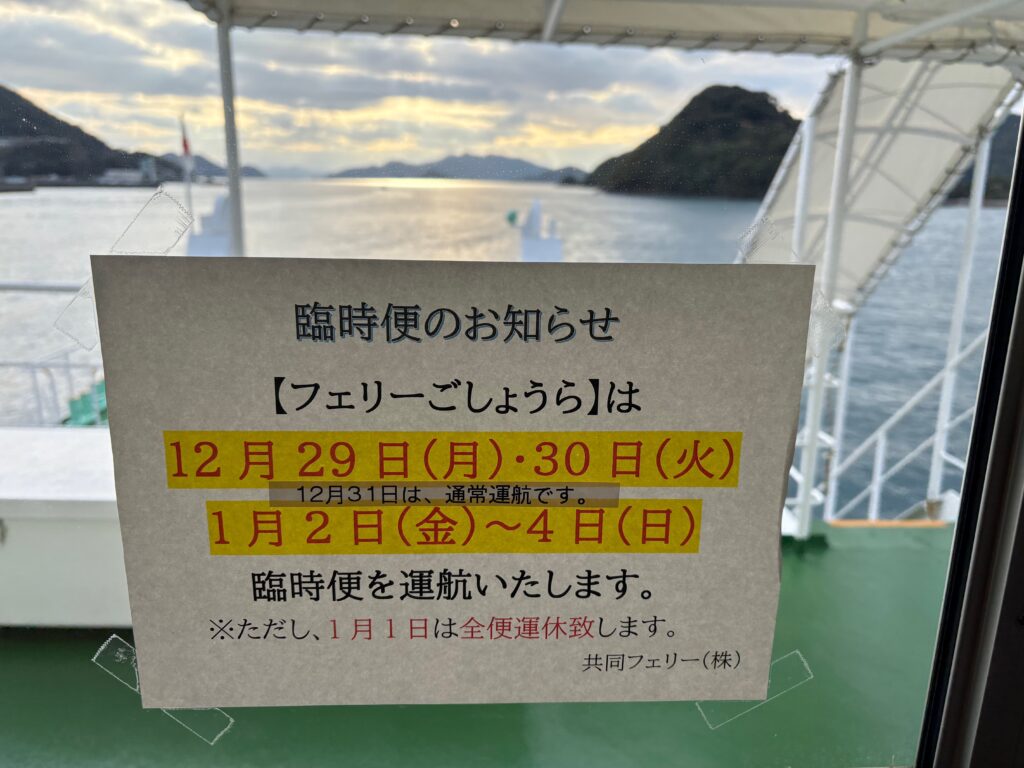 船内には年末、年始のフェリー運行情報の張り紙がありましたよ。