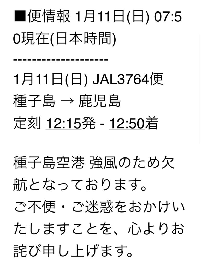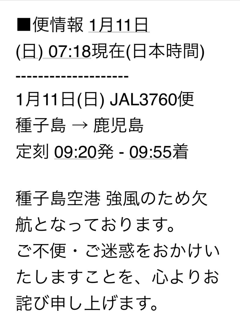 「種子島空港強風のため、天候調査中です。」