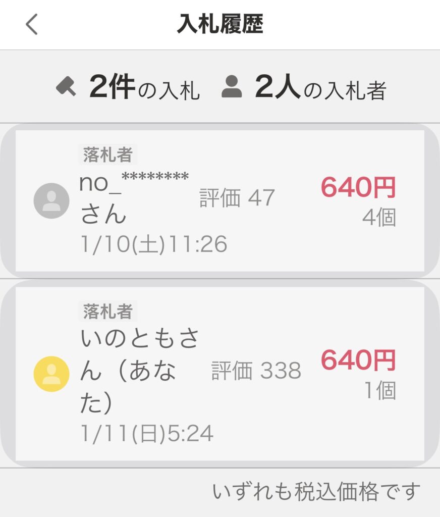 私の落札時間は、1月11日の5時24分になっていますね。