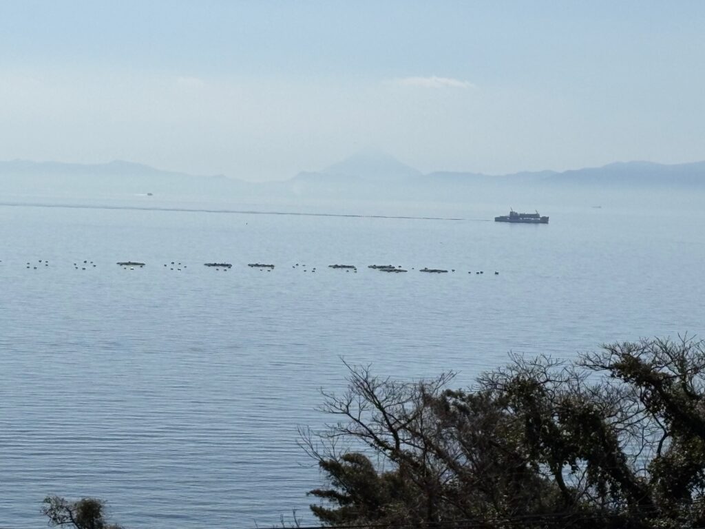 手前には養殖イカダ、