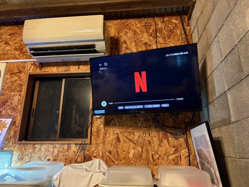 奥には大型テレビとエアコンが設置されており