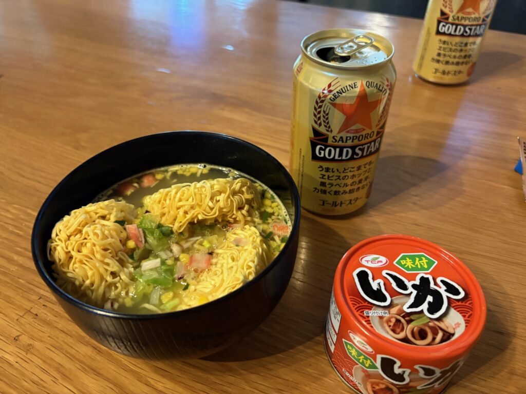 シーフードラーメンと、缶詰イカがベストマッチでしたよ。